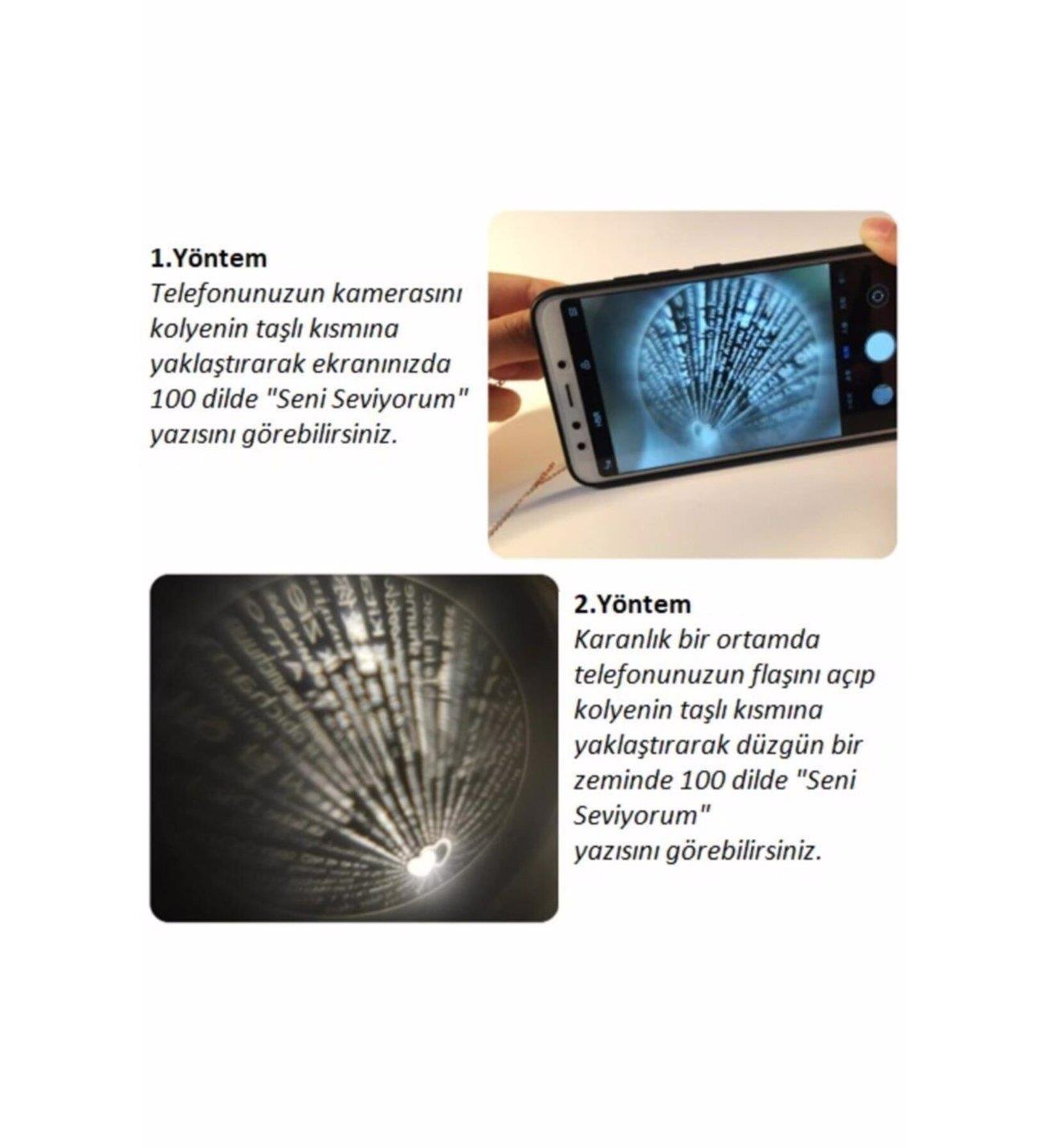 Kolyemizin orta kısmında bulunan özenle hazırlanmış taş içerisinde 100 farklı dilde seni seviyorum yazısı bulunmaktadır.Bu yazı karanlık bir ortamda ışık vasıtası ile yansıtılabilir ve görülebilir.Kullanırken kimyasal maddelerden uzak tutulmasına özen gösterilmelidir.