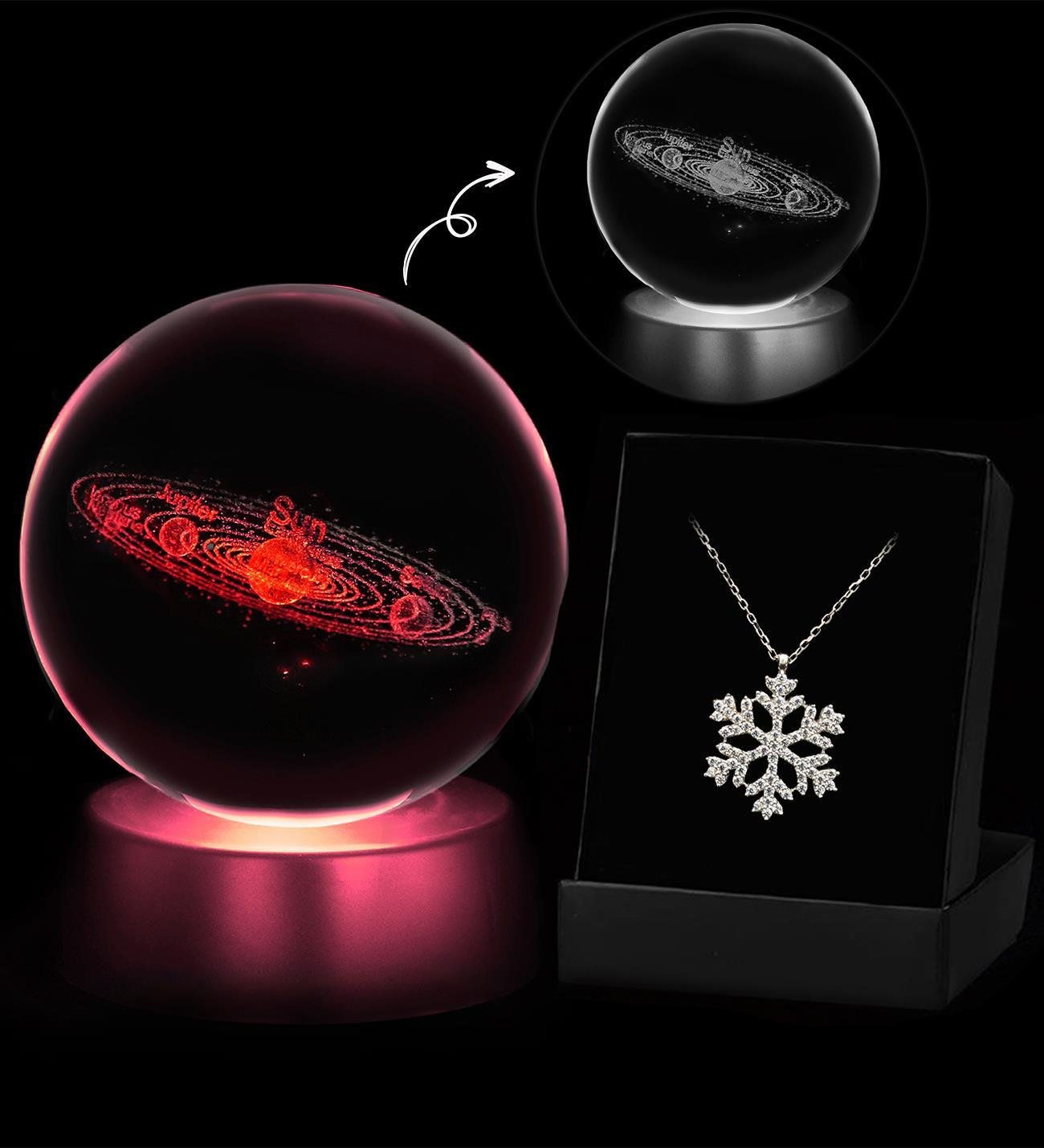 3D Samanyolu Galaksi Temalı Işıklı Cam Küre & Gümüş Renk Kar Tanesi Kolye Hediye Seti