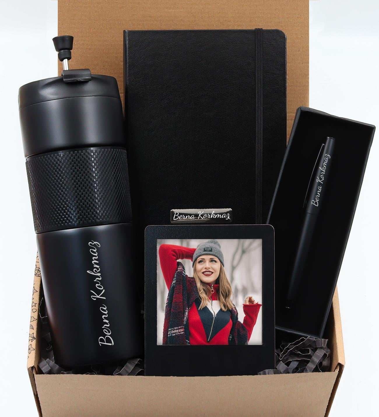 French Press Kupa Termos & Siyah Defter &Kişiye Özel Fotoğraf & Siyah Mat Kalem hediye seti sevdikleriniz için unutulmayacak bir hediye seçeneğidir.