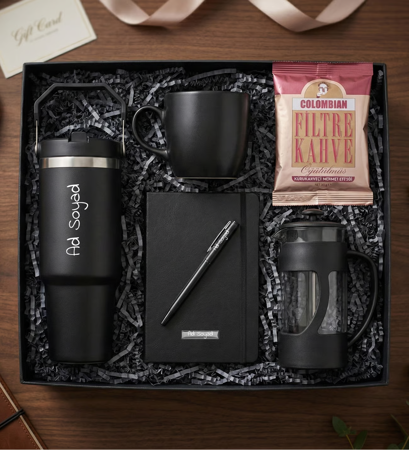 Kişiye özel defter ve kalem, günlük notlar ve planlamalar için hem estetik hem de işlevsel bir kullanım sağlar. Filtre kahve ise sete lezzetli bir dokunuş katarak hediyeyi daha da özel hale getirir.
