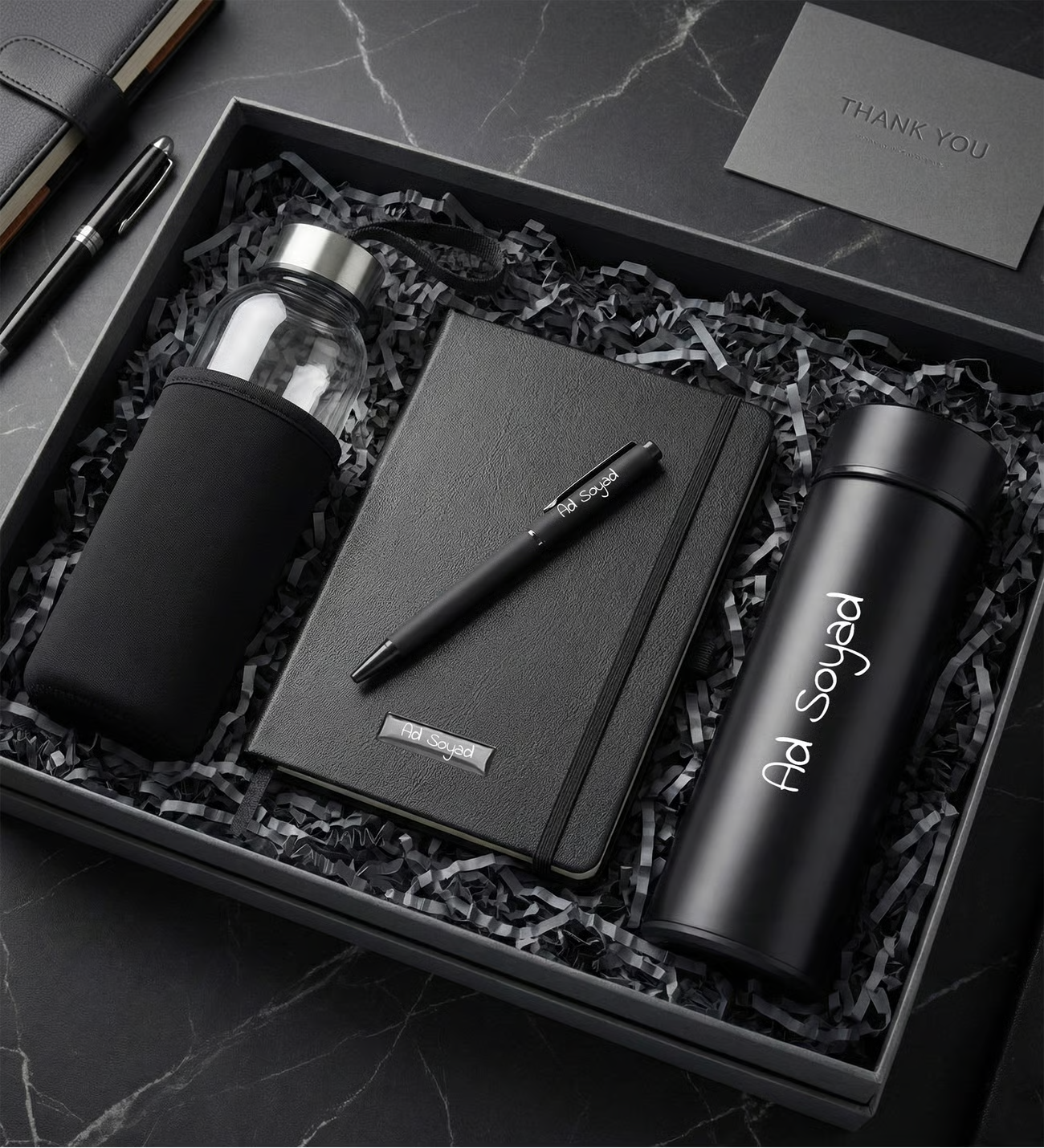 Akıllı dereceli kapağa sahip 450 mL termos, içeceğin sıcaklığını anlık olarak göstererek pratik bir kullanım sağlar. 500 mL cam matara, özel koruyucu kılıfı sayesinde güvenli taşıma imkânı sunar ve günlük kullanım için idealdir. Kişiye özel baskı uygulanabilen siyah defter ve roller kalem, ofis ortamında profesyonel bir görünüm kazandırır.
