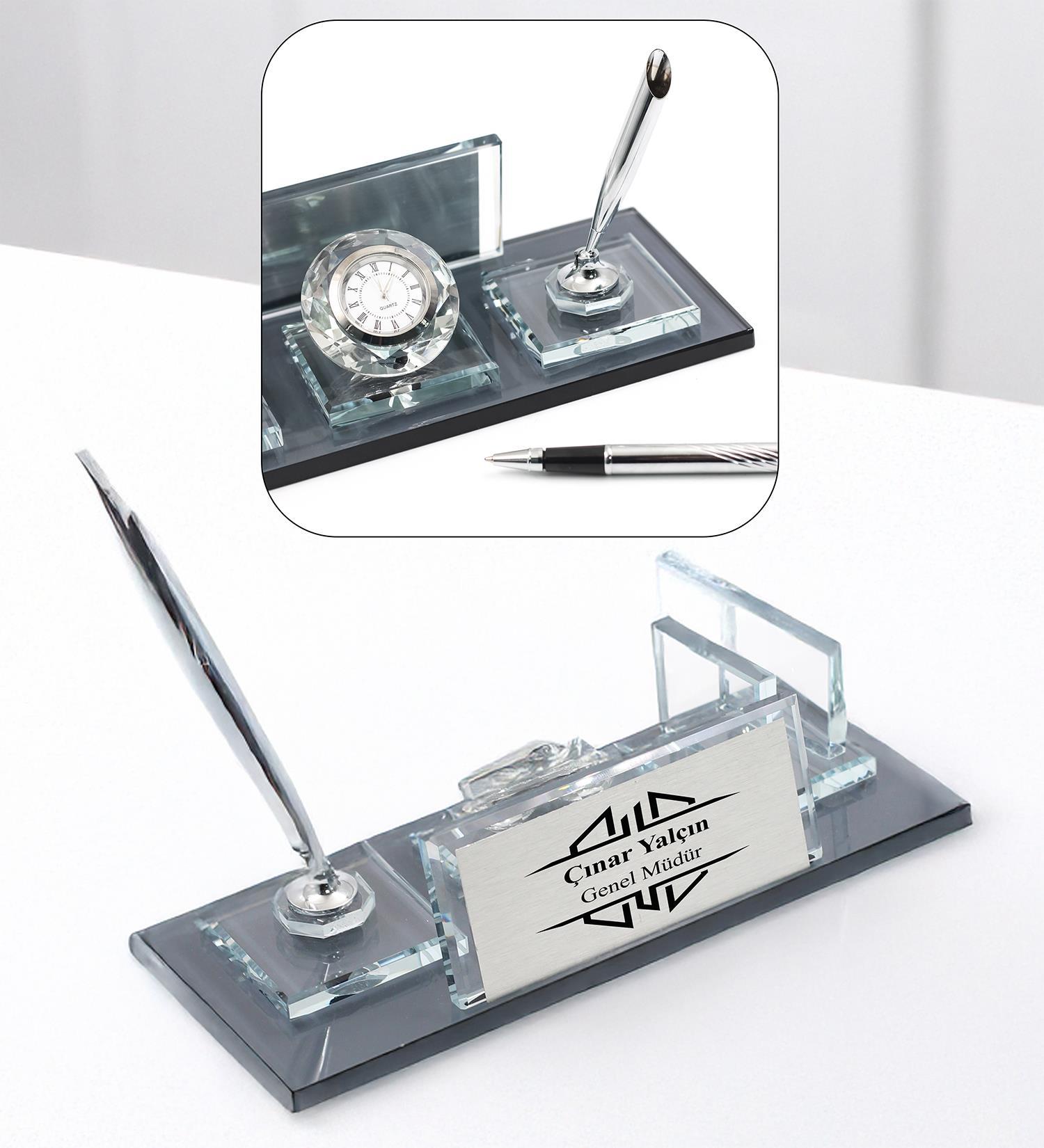 Gümüş metal kalemi, değiştirilebilir pilli masa saati ve kristal kartvizitlik bölmesiyle sadece dekoratif değil, aynı zamanda kullanışlıdır. Özel kesim ve net hatlara sahip baskı alanı sayesinde, isim ve unvanınız en şık şekilde sergilenir.