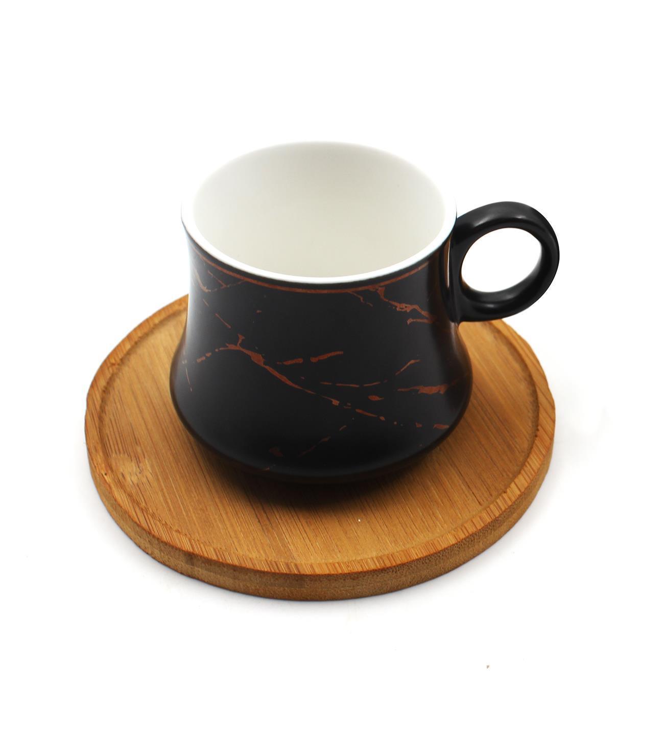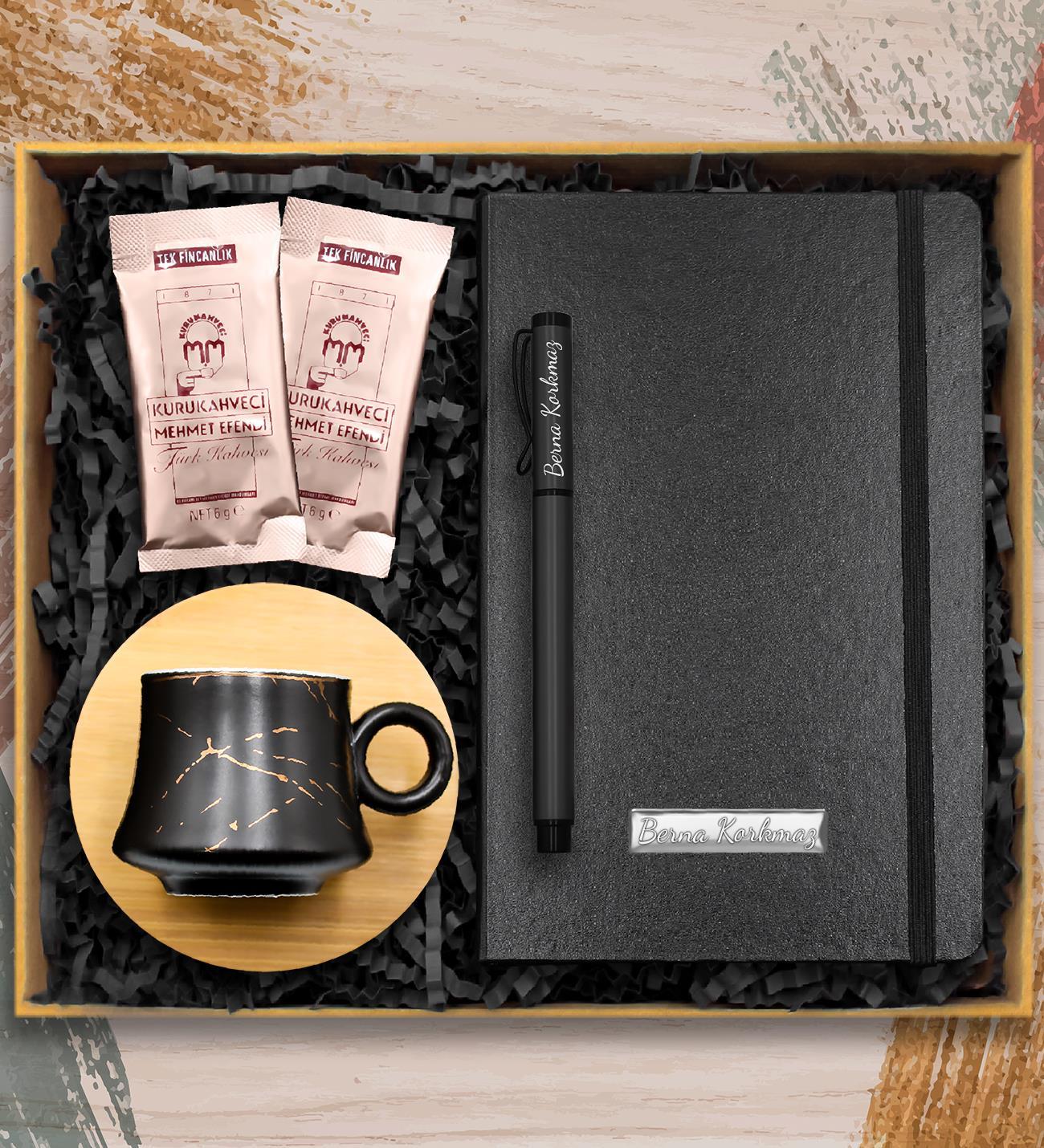 Kişiye Özel Roller Kalem & Siyah Defter & Bambulu Mermer Desenli Fincan & 2'li Mehmet Efendi Kahve Hediye Seti